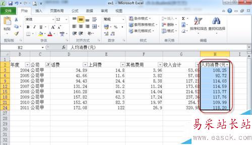 5、選定“人均消費(元)”列的數據元格;例,如圖