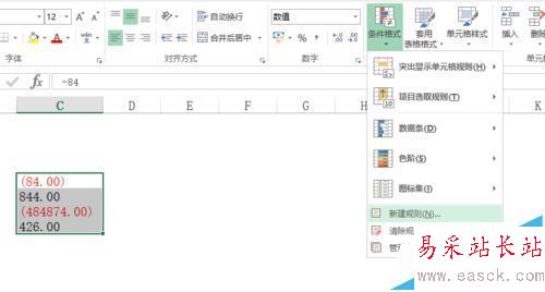 3、這個規則就是數字顯示的規則,我們可以設定一種新的規則讓數字顯示的更加的醒目,如題目所說正數打勾,負數打叉。選中該區域單元格,選擇條件格式中的新建規則。