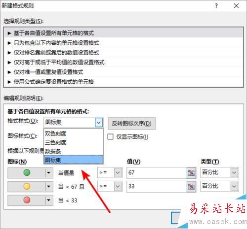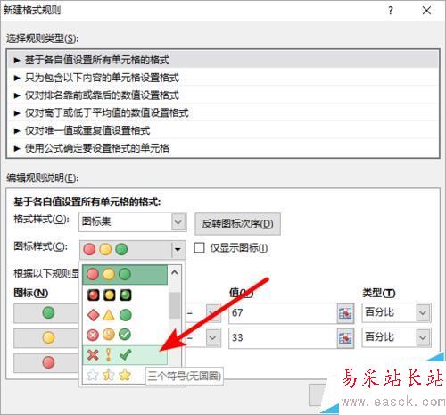 5、設置一下圖標的樣式,在樣式中分為三種條件格式的圖標,分別是大于等于和小于。如圖所示: