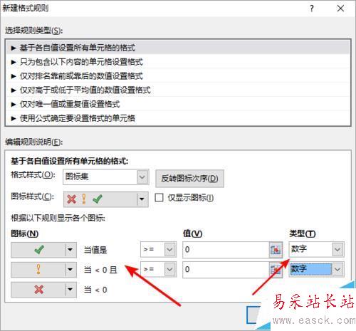 6、接著我們設置條件格式的具體數值,這里我們設置為大于0小于0和等于0.類型改為數值。如圖所示: