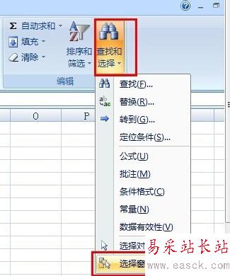 在Excel中的功能區的“開始”中找到“查找和選擇”,點擊它。
