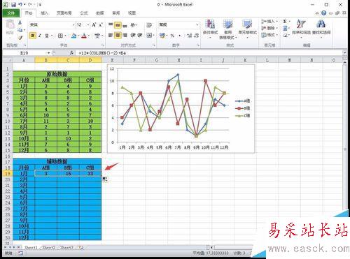 2、首先將上面的數據復制粘貼下來,并起名為“輔助數據”,然后在左上角第一個單元格中輸入“=12*(COLUMN()-2)+B4”,按回車鍵,其中12是比原始數據中最大值稍大一點的數據值,用于作為層高,B4是原始數據中對應位置的單元格。