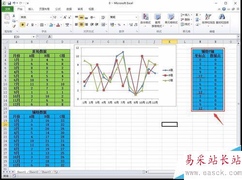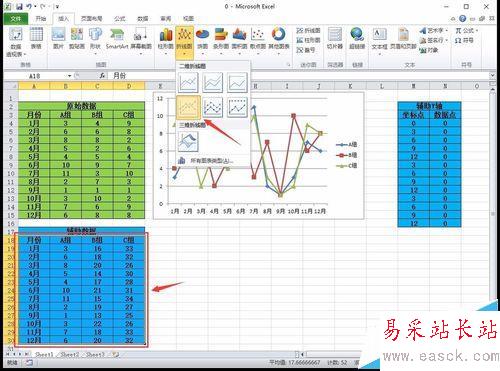4、然后按照下圖中的方式在Excel表格中輸入三組坐標點和數據點,分別是0、3、6、9、12,3、6、9、12和3、6、9、12,數據點均為0;下面選中輔助數據,點擊“插入>折線圖>帶數據標志的折線圖”,繪制出原圖圖形,并選中其縱坐標,按“Delete”鍵刪除掉,如圖所示。
