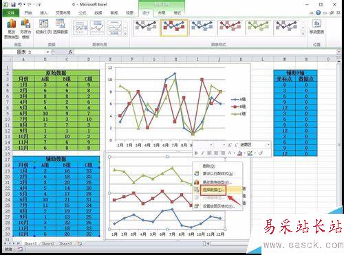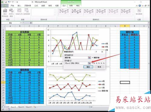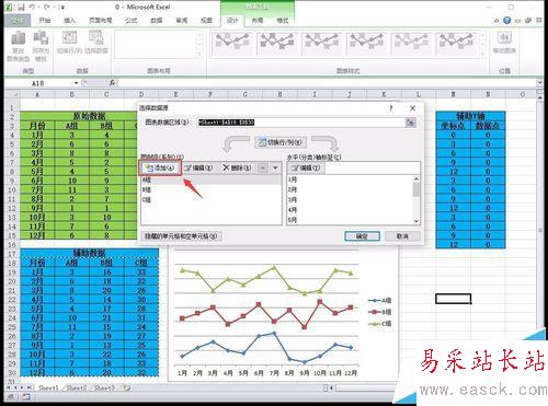 5、接下來,選中折線圖,單擊鼠標右鍵,點擊“選擇數據”選項,在彈出對話框中點擊“添加”按鈕,接著將系列名稱設置為“輔助Y軸”,系列值設置為“數據點”,如圖所示。