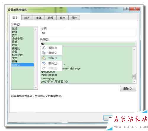 3、選中你要設置№序號的單元格(或列、行),右鍵自定義單元格格式,在自定義輸入框里插入光標,然后粘貼進入“№”符號。