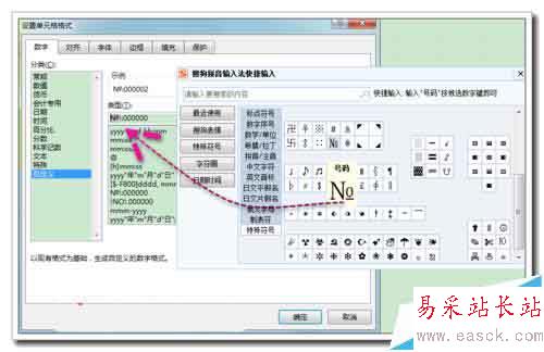 2、選中你要設置№序號的單元格(或列、行),右鍵自定義單元格格式,在自定義輸入框里插入光標,然后點擊【特殊字符】中的“№”,插入該符號,最終設置如圖所示的自定義格式。