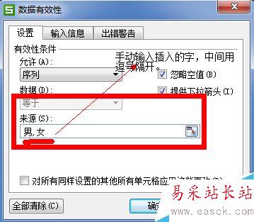 5、在來源里面手動添加需要的字樣,中間使用逗號隔開。
