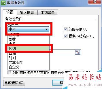 4、在設置有效性條件下面的允許里面下拉找到序列;