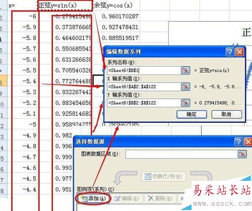 4、在彈出的“選擇數據源”對話框中選擇“添加”,彈出“編輯數據系列”對話框,如圖,選擇我們準備好的數據,點“確定”。這樣正弦函數圖像就添加上了,同樣把余弦函數也添加上。