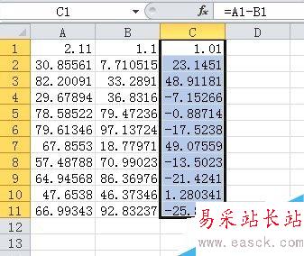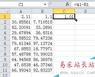 4、這時你會發現:每一行的A列數據減去B列數據的差值都列在了同行的C列中