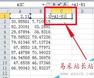 1、比如我們要計算每一行的A列數據減去B列數據的值,并把該差值放在C列。