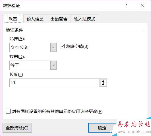 在彈出的界面中,設置允許部分改為“文本長度”,數據設置“等于”,長度填寫“11”再點擊確定。如此一來,這一列中所有的單元格都必須輸入11位的數字才能夠正確輸入。