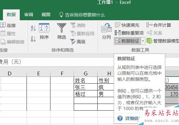 且慢,你是不是以為只能數字限制,性別處就無法設置了?當然不是,小編之所以能提出來,自然有解決辦法。老樣子先選中性別一列(不包括名稱欄),然后再允許部分選擇“序列”,來源部分寫上“男,女,”注意逗號為英文半角。另外確認“序列”右側“提供下拉箭頭”為勾選狀態。
