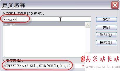 第二步:點擊菜單命令“插入→名稱→定義”,打開的“定義名稱”對話框。在“在當前工作簿中的名稱”下方輸入框中輸入我們定義的名稱,比如“mingyan”。然后在“引用位置”下方的輸入框中輸入公式“=OFFSET(Sheet2!$A$1,HOUR(NOW()),0,1,1)”。不包括外層雙引號,且公式輸入應在英文的半角狀態下完成。如圖2所示。輸入完成后,點擊“確定”按鈕,關閉對話框。