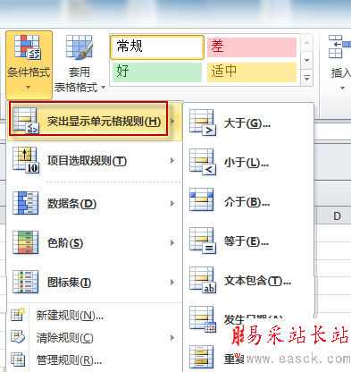 再次單擊“條件格式”,移動鼠標到顯示的下拉菜單“突出顯示單元格規則”上,在展開的菜單中單擊“介于”命令,在彈出的對話框中輸入值“500”到“999”,設置為“自定義格式”,并在彈出的對話框中的“顏色”中選擇綠色。