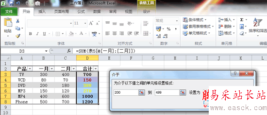 再次單擊“條件格式”,移動鼠標到顯示的下拉菜單“突出顯示單元格規則”上,在展開的菜單中單擊“介于”命令,在彈出的對話框中輸入值“200”到“499”,設置為“自定義格式”,并在彈出的對話框中的“顏色”中選擇黃色。