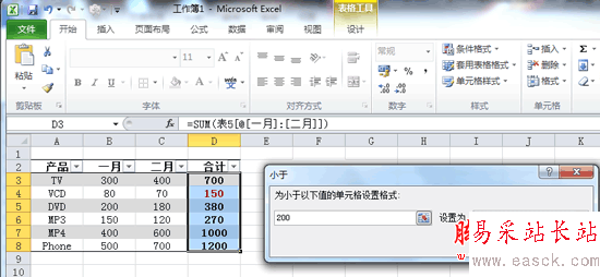 在“開始”選項卡中,鼠標左鍵單擊“條件格式”,移動鼠標到顯示的下拉菜單“突出顯示單元格規則”上,在展開的菜單中單擊“小于”命令,在彈出的對話框中輸入值“200”,設置為“紅色文本”。
