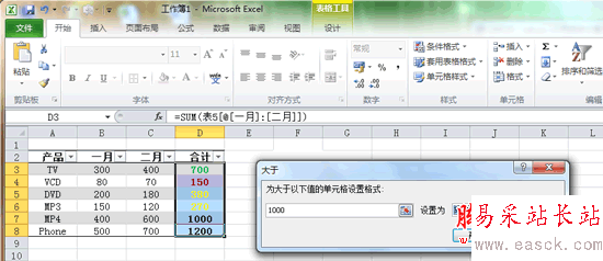 再次單擊“條件格式”,移動鼠標到顯示的下拉菜單“突出顯示單元格規則”上,在展開的菜單中單擊“大于”命令,在彈出的對話框中輸入值“1000”,設置為“紅色邊框”。