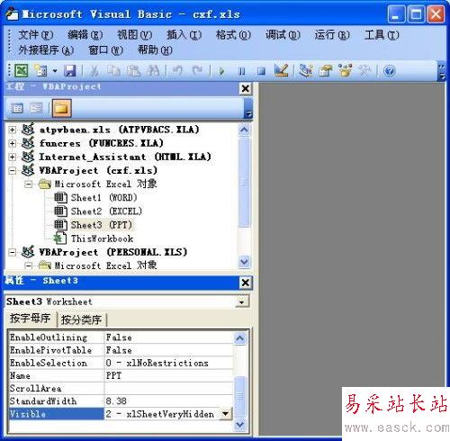 4、選中相應工作簿中需要隱藏的工作表(如“Sheet3(PPT)”),然后在下面的屬性窗口中,找到“Visible”選項,單擊其右側的下拉按鈕,在隨后出現的下拉列表中,選擇 “0-xlSheetVeryHidden”選項。