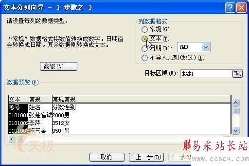 5.分列完畢后,單擊“下一步”,設置每列的數據類型。如:第一列要設置為“文本”,否則分列后,考號最前面的“0”將被舍去;而第三列設置為“常規”即可,Excel將按單元格中的內容自動判斷并設置數據類型。如圖6。