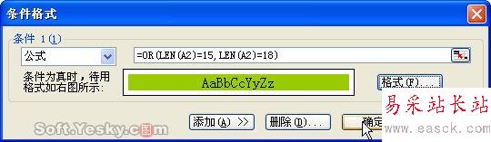 小提示:上面的操作,先選中了一個(gè)單元格范圍A2:A52,然后為這個(gè)單元格范圍設(shè)置條件格式的公式。在這種情況下,公式中應(yīng)使用選擇范圍中左上單元格的引用,此例中為A2。公式輸入完成后,可以查看一下這個(gè)范圍中的其它單元格的條件格式公式,如A8單元格,為 “=OR(LEN(A8)=15,LEN(A8)=18)”,這是由于上面的引用為相對(duì)應(yīng)用,它會(huì)根據(jù)單元格的實(shí)際偏移量自動(dòng)改變,從而得到適合其它單元格的公式。