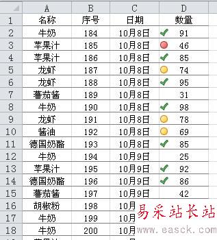 圖中先對D列設置了“四色交通燈”圖標樣式,然后對較大的一些數值設置了另一種圖標樣式“綠色復選符號”,而對于較小的一些數值,則隱藏了單元格中的圖標,這樣看起來更加醒目一些。