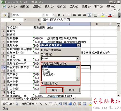 4、在選擇“下列選擇工作表之前”內(nèi)的“sheet1”表示將表格轉(zhuǎn)移到“sheet1”前面。