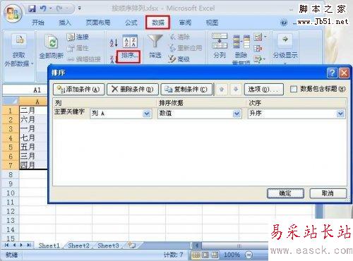2、依次打開菜單欄“數據”→“排序”,這時我們會看到彈出一個“排序”的對話框;