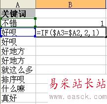 3、拖動2中的公式應用到下面剩余的單元格中,重復出現的詞旁邊單元格的值變為2,否則就是1: