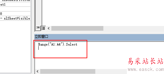 6、在立即窗口中輸入一條指令,讓A1至A4的單元格被選中。