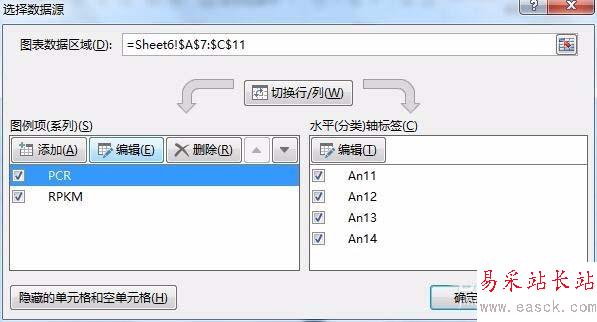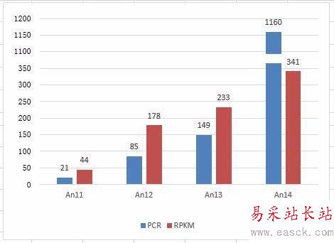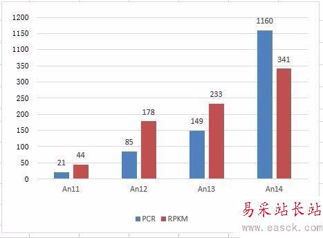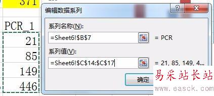 3、將柱狀圖中PCR的數據改為PCR_1的數據,操作如下:選擇PCR數據柱,右鍵>選擇數據>編輯>選取數據>系列值選為PCR_1的數據>確定>確定,得新的柱狀圖。