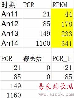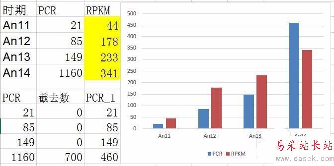 2、根據相差最大的兩個數據:1160和371,選擇將PCR列的部分數據抽走,構建新的數據列。如下圖,我們需要確定比較大的數據到底調整到什么程度,然后取一個截去數,這里選取700(因為前三行數據無需縮小,所以截去數1)將對應的PCR數據減去截去數,得到新的數據列PCR_1。