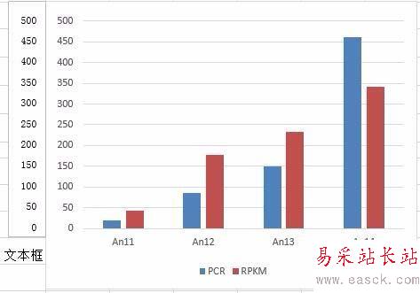 4、創建橫排文本框,鍵入Y軸坐標軸數據,并調整使得和柱狀圖Y軸數據位置一致。復制橫排文本框,選中柱狀圖,Ctrl+V粘貼文本框(使用這種方法添加的元素是和圖表融為一體的)。調整文本框位置,覆蓋原Y坐標軸。
