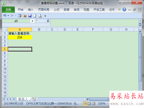 3.1. 在A1單元格輸入提示文字“請(qǐng)?jiān)贏2中輸入查看密碼”