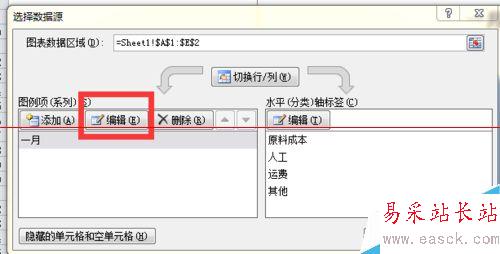 5、設置完控件,點擊控件的下拉三角形,即可出現,一月到六月的選項,不過圖表還不能被控制。接著,點擊餅狀圖,【右鍵】,【選擇數據】,點擊【編輯】,將”系列值“下面的改為:=Sheet1!自己命名。注意:此處必須和之前命名一樣。