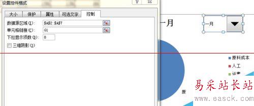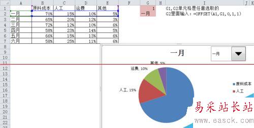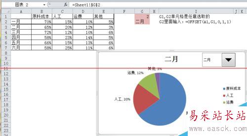 6、點擊【確定】設置完后,我們可以通過點擊控件的月份得到當月的圖表,不過標題始終顯示為”一月“?,F在就對標題進行調整:首先可以發現G1里面出現數字,且隨著下拉菜單的月份進行變化。如:六月顯示6。在G1附近,我選擇G2,輸入公式:=OFFSET(A1,G1,0,1,1)  按enter鍵就會出現和G1數字對應的月份。然后點中圖表中的【一月】,在公式欄輸入:=Sheet1!$G$2。按enter鍵后,就全部完成。