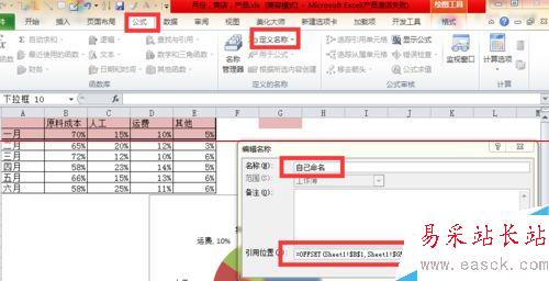 3、圖表設置完后,點擊【公式】,【定義名稱】。名稱可根據自己的喜好命名。如:”自己命名“,在引用的位置處輸入:=OFFSET(Sheet1!$B$1,Sheet1!$G$1,0,1,4)。確認及可。注意:G1是任意選取的,要記住此單元格,下面要用到。注意:命名也要記住