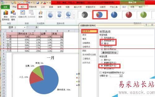 2、先做出一月份的圖表:選中粉色區,點擊【插入】【餅狀圖】,【圖表工具】【布局】【設置數據標簽格式】