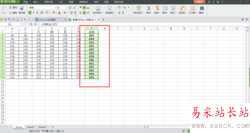 5、如圖所示,選中【總和】所在列的第一個數將鼠標放到其右下角變成黑色十字架形狀,按下鼠標左鍵,向下拉動就會自動生成所有行的總和,是不是很快很方便呢?。?!