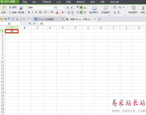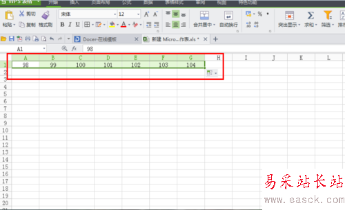 2、打開工作表后在A1任意輸入一個數,選中并將鼠標放到其右下角變成黑色十字架形狀,按下鼠標左鍵,向右拉動就會自動生成相應數,如圖所示。