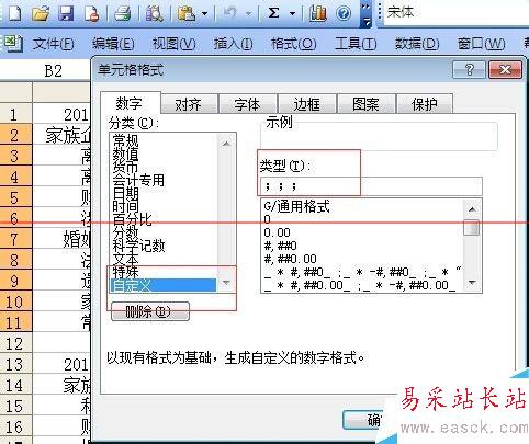 3、再在單元格格式中選擇“自定義”,把類(lèi)型“G/通用格式”改為“;;;”,如圖所示: