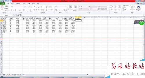 1、打開填制好數據的工資表。選擇需要計算結果的單元格,點擊編輯欄上面的“插入函數”