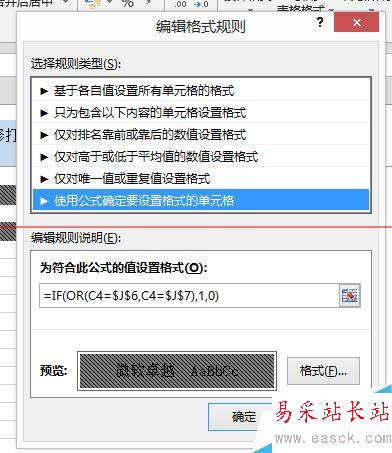 7、在如下紅色框內(nèi)輸入:”=IF(OR(C4=$J$6,C4=$J$7),1,0)“,在下面預(yù)覽后面格式選擇你喜歡的樣式,確定,就可以了。