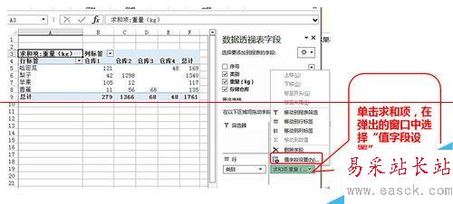 8、大部分情況下匯總按“求和”方式計算,如果需要修改匯總數量的計算方式,可進行如下修改。單擊求和項,在彈出的窗口中選擇“值字段設置”。