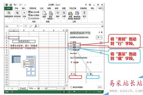 5、將“類別”拖動到“行”字段。將“重量”拖動到“值”字段。