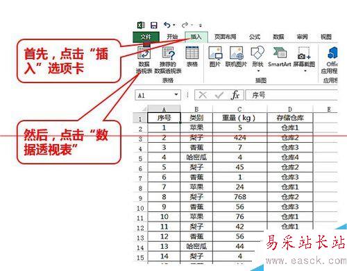 6、就可以得到這樣一張透視表,直接統計出了每種類別的重量。如果還想具體細分到每個倉庫每種類型水果的重量,還可以進行下面的操作。