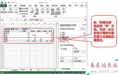 7、將“存儲倉庫”拖動到“列”字段。可進一步分類統計每種水果在每個倉庫的存儲重量。