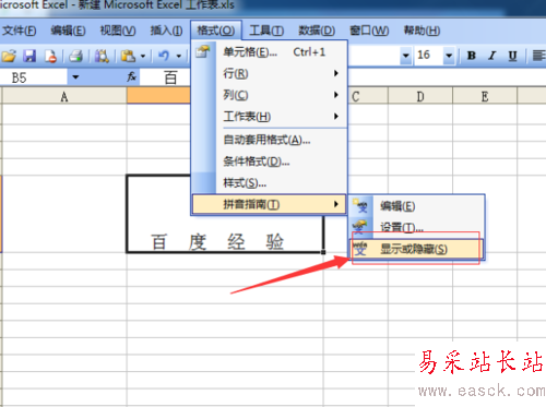 添加完之后,進(jìn)行選中的單元格中內(nèi)容,再次選中excel中格式,拼音指南,“顯示或隱藏”。