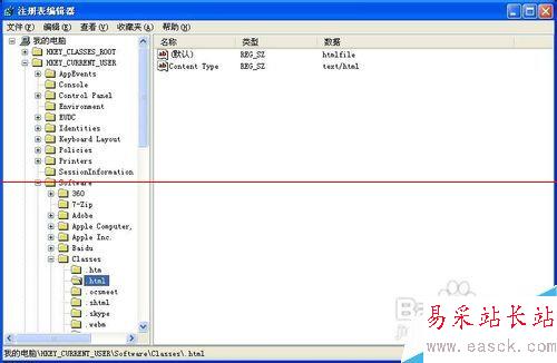 2、在注冊表中,導(dǎo)航到HKEY_CURRENT_USER/Software/Classes/.html 項(xiàng)