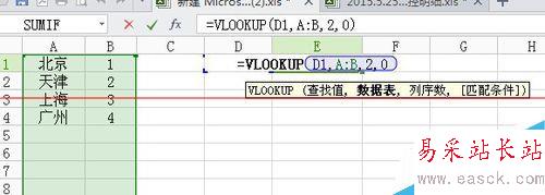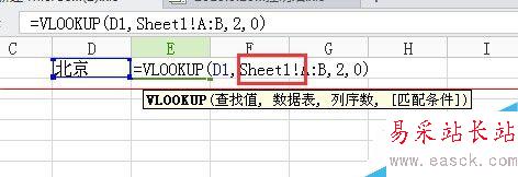 2、如圖,如在D1單元格輸入“北京”,將在E1單元格輸出“1”,在E1單元格輸入公式E1=VLOOKUP(D1,A:B,2,0)